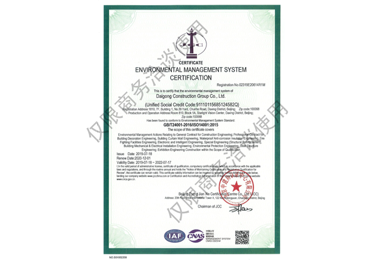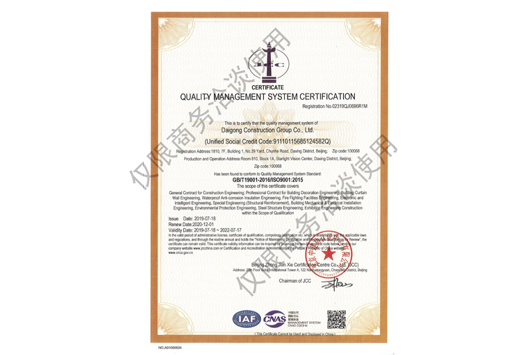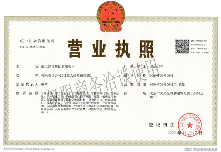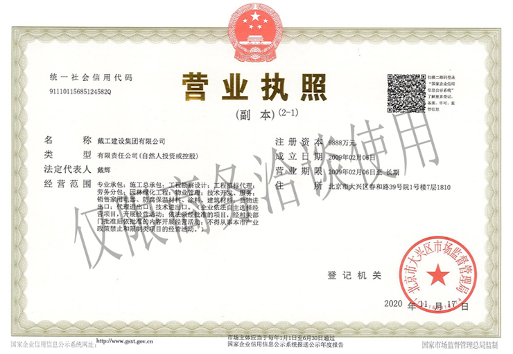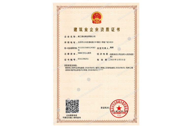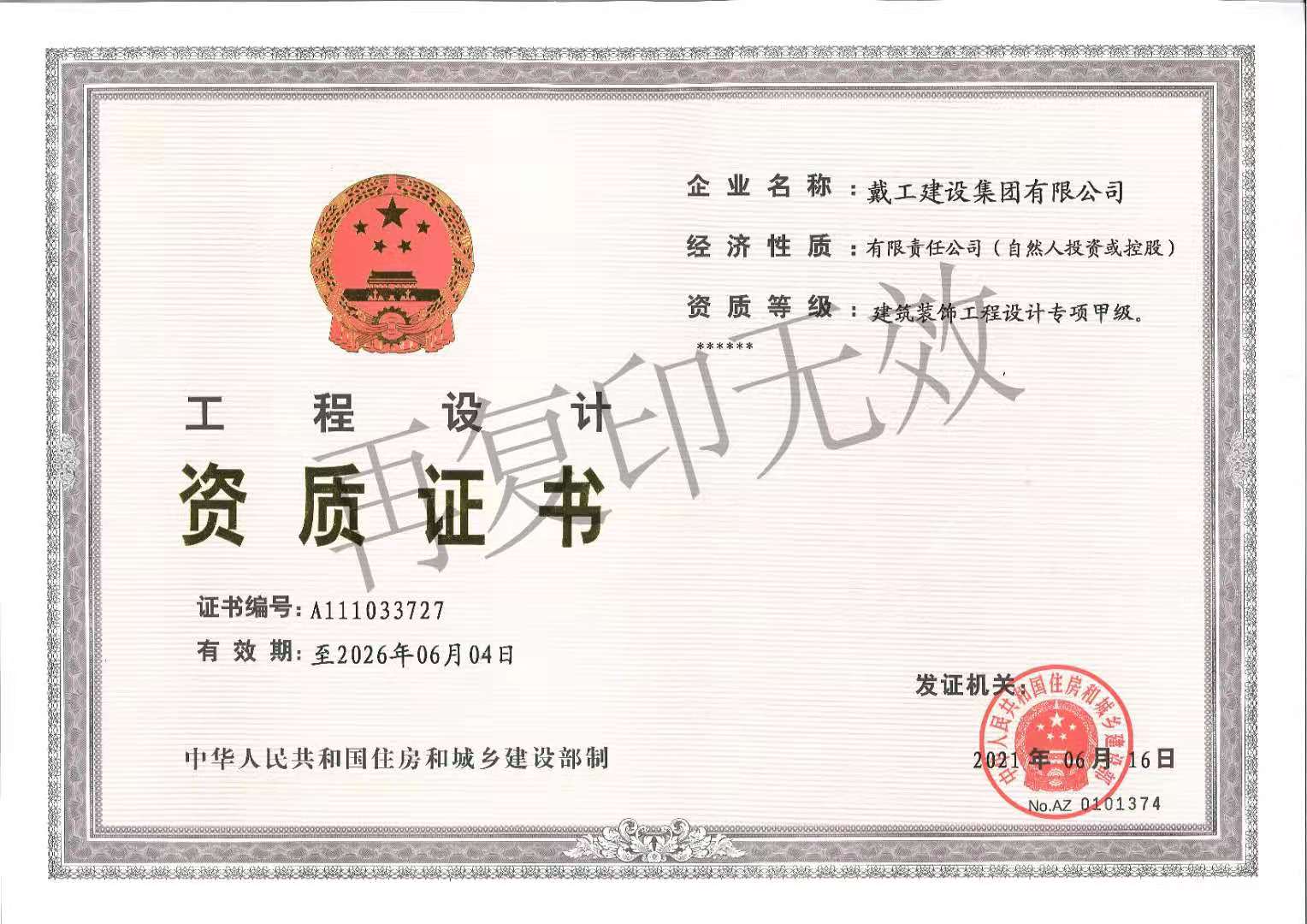 戴工建設(shè)集團有限公司,創(chuàng)建于2009年,注冊資本9888萬元人民幣。公司位于北京市大興區(qū)。具有建委頒發(fā)的建筑裝飾裝修專業(yè)壹級,防水保溫工程專業(yè)壹級,建筑幕墻專業(yè)貳級,消防設(shè)施專業(yè)貳級,電子與智能化專業(yè)貳級,特種工程(結(jié)構(gòu)補強)專業(yè)不分等級,建筑機電安裝專業(yè)貳級,環(huán)保工程專業(yè)貳級,鋼結(jié)構(gòu)專業(yè)貳級,建筑工程總承包貳級,建筑裝飾工程設(shè)計專項甲級,展覽陳列工程設(shè)計與施工壹級,展覽展示工程壹級...更多>>